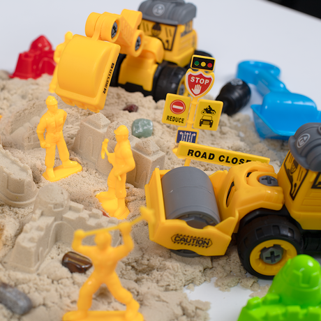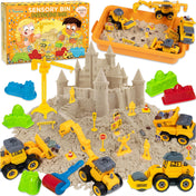 Sensory Bin: Construction Zone - Cutie Senzorială Completă cu Nisip Magic, Vehicule, Muncitori și Accesorii Diverse